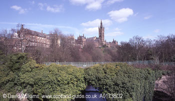 This the tower of Glasgow University, one of the city`s most important landmarks. The university, which dates back to 1451, has many visitor attractions including The Mackintosh House, a replica of Charles Rennie Mackintosh`s house which stood nearby; it contains many of his most famous items of furniture. The university and its museums are described in Walk 6. |