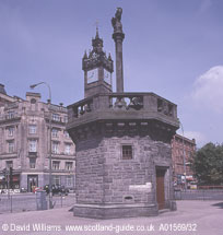This is the Mercat Cross, a replica of the cross removed from here in 1659. |